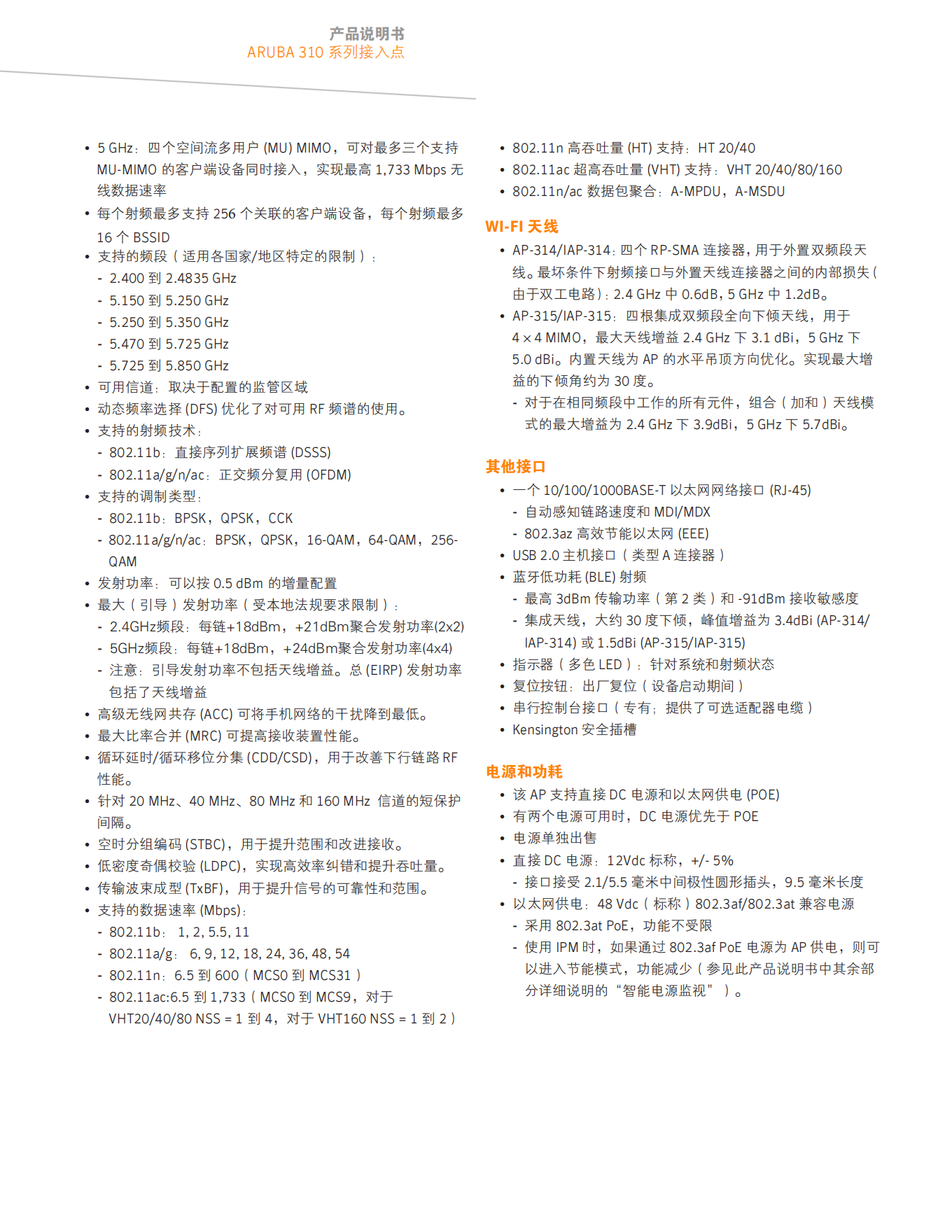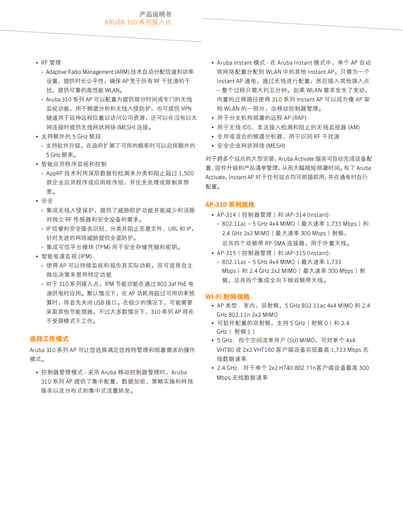 AP-315(控制器管理)和 IAP-315 (Instant):802.11ac – 5GHz 4x4 MIMO( 大速率 1,733 Mbps)和 2.4GHz 2x2 MIMO( 大速率 400 Mbps)射頻,總共四個(gè)集成全向下傾雙頻帶天線。