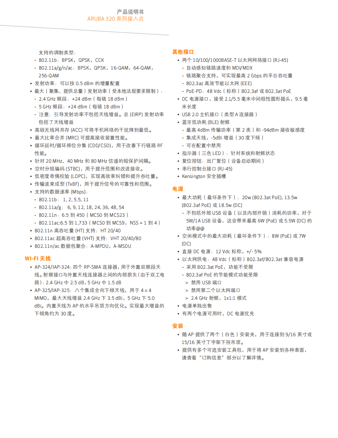AP-325 和 IAP-325 ,5 GHz( 大速率 1,733 Mbps)和 2.4 GHz( 大速率 800 Mbps)射頻,均具有 4x4 MIMO 支持,總共八個集成全向下傾天線。四個空間流 SU-MIMO,可對單個客戶端設備實現 高 1,733 Mbps 的無線數據速率。三個空間流 MU-MIMO,可對三個支持 MU-MIMO 的客戶端設備同時實現 高 1,300 Mbps 無線數據速率。