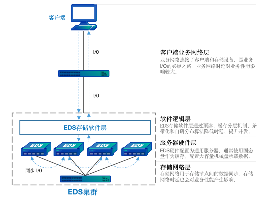 評估一套存儲,性能是核心指標之一。而影響存儲性能的因素通常有很多種,比如硬件配置、網絡時延、存儲軟件處理流程等。為了了解深信服分布式存儲EDS在每一部分的優化措施,我們將一個業務I/O流程歸納為以下四層: