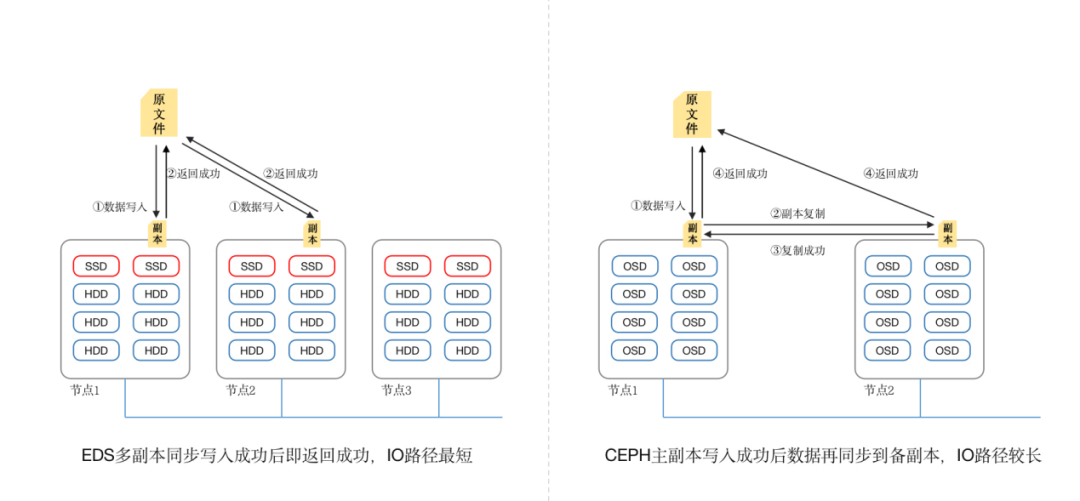 EDS通過多副本和糾刪碼的方式進行數據冗余,以副本機制為例,多份副本并發寫入存儲節點的固態盤,寫入成功即向應用返回成功,沒有主備副本之分。對比開源存儲架構CEPH的副本分發機制,EDS的I/O路徑更短,寫時延更低。