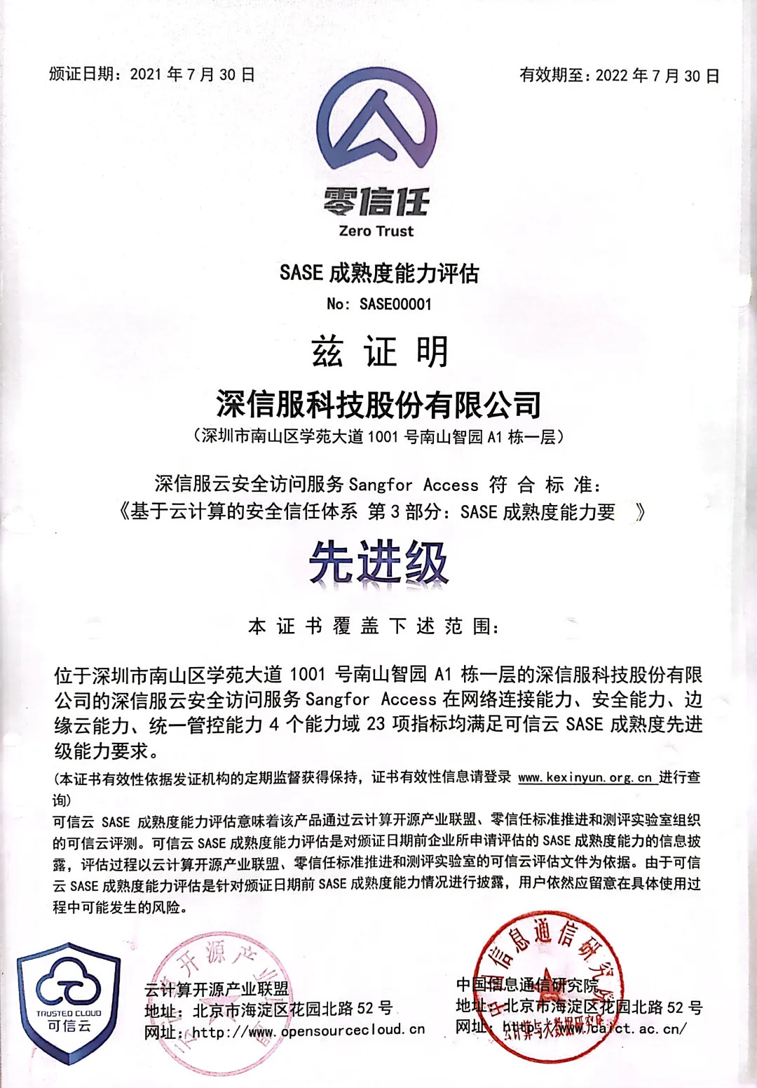7月27日,由中國信息通信研究院(以下簡稱“中國信通院”)、中國通信標準化協會聯合主辦的2021可信云大會正式開幕。大會現場解讀了由中國信通院牽頭、深信服等多家企業聯合起草的《基于云計算的安全信任體系》系列標準,并公布了SASE成熟度能力、零信任安全能力評估結果,深信服成為首批通過先進性評估的安全廠商,同時作為零信任標準推進和測評實驗室副理事長單位參與授牌儀式。