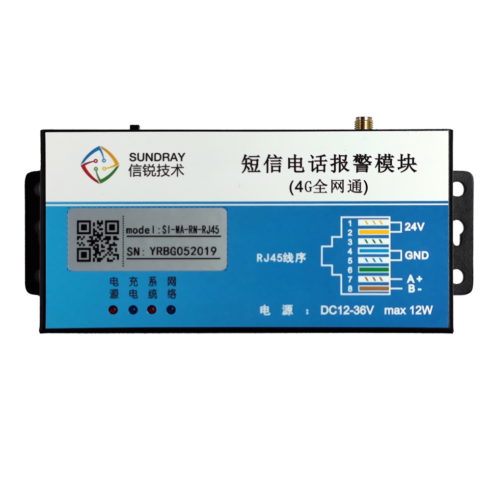 SI-MA-RN-RJ45是信銳自主開發的4G短信電話告警模塊,采用RJ45非標準網絡接口,用于給設備輸入電源以及實現RS485串行通信;RS485電路內置15KV ESD保護,采用自定義通信協議。
